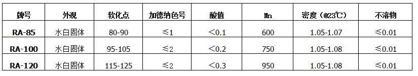 RA系列α-甲基苯乙烯單體樹脂(AMS樹脂): 為水白色樹脂,由苯乙烯單體制造而成。 * 在TPE材質(zhì)的熱熔壓敏膠中,可增加內(nèi)聚力、耐熱性及流動(dòng)性; |